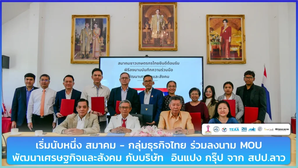 เมื่อวันอังคารที่ 17 ธันวาคม 2567 ที่ผ่านมา ณ ที่ทำการ สมาคมชาวเกษตรกรไทย จ.ปทุมธานี ได้มีพิธีลงนามบันทึกความเข้าใจ MOU (Memorandum of Understanding) ระหว่างสมาคม – กลุ่มธุรกิจจากประเทศไทย และ บริษัท อินแปง กรุ๊ป จำกัด โดยนาย แอ๊ด พันนิวงศ์ ประธานกรรมการบริหาร จากสาธารณรัฐประชาธิปไตยประชาชนลาว (สปป.ลาว)